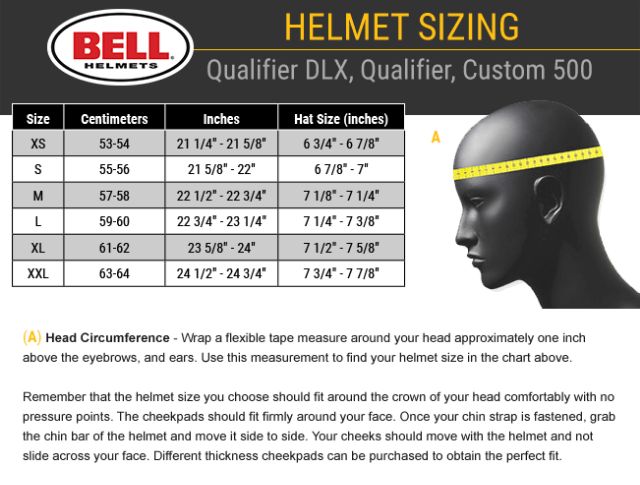 Sorry if I am late to the party but to reassure you I have both a Schuberth C2 size 5859 and a Bell Custom 500 RSD carbon size 59-60 so L is the definitely the way to go. Step 2 - Positioning. Size Chart for Bell Custom 500 Qualifier Qualifier DLX MX-9 MX-9 ADV Models Only.